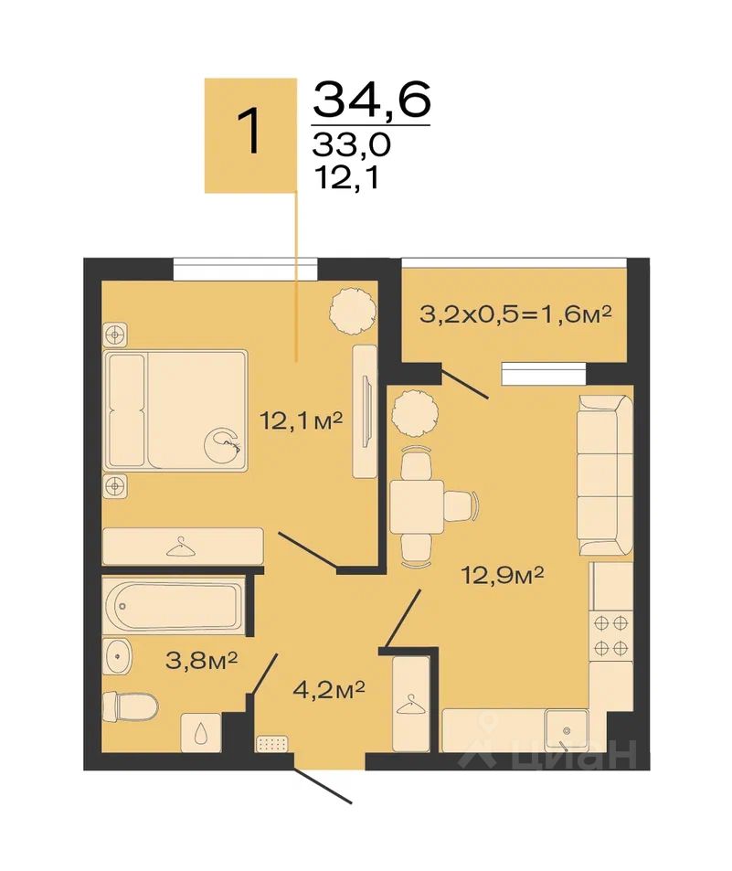 Общая площадь34,6 м²