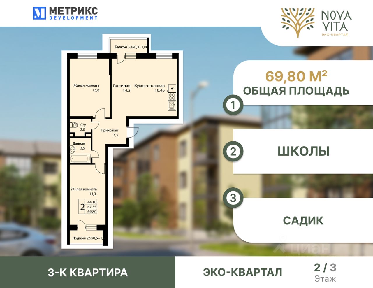 Продаётся 3-комнатная квартира в строящемся доме (Литер 19), срок сдачи: IV-кв. 2025, общей площадью 70.2 кв.м., на 2 этаже. Новый жилой комплекс "Nova Vita" от застройщика МЕТРИКС DEVELOPMENT расположен по адресу Краснодар, посёлок Берёзовый, улица имени А.Н. Лодыгина.