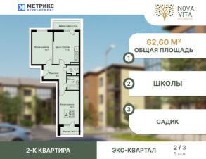 Продаётся 2-комнатная квартира в строящемся доме (Литер 22), срок сдачи: IV-кв. 2025, общей площадью 63.5 кв.м., на 2 этаже. Новый жилой комплекс "Nova Vita" от застройщика МЕТРИКС DEVELOPMENT расположен по адресу Краснодар, посёлок Берёзовый, улица имени А.Н. Лодыгина.