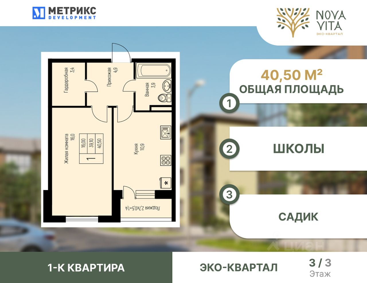 Продаётся 1-комнатная квартира в строящемся доме (Литер 22), срок сдачи: IV-кв. 2025, общей площадью 40.9 кв.м., на 3 этаже. Новый жилой комплекс "Nova Vita" от застройщика МЕТРИКС DEVELOPMENT расположен по адресу Краснодар, посёлок Берёзовый, улица имени А.Н. Лодыгина.