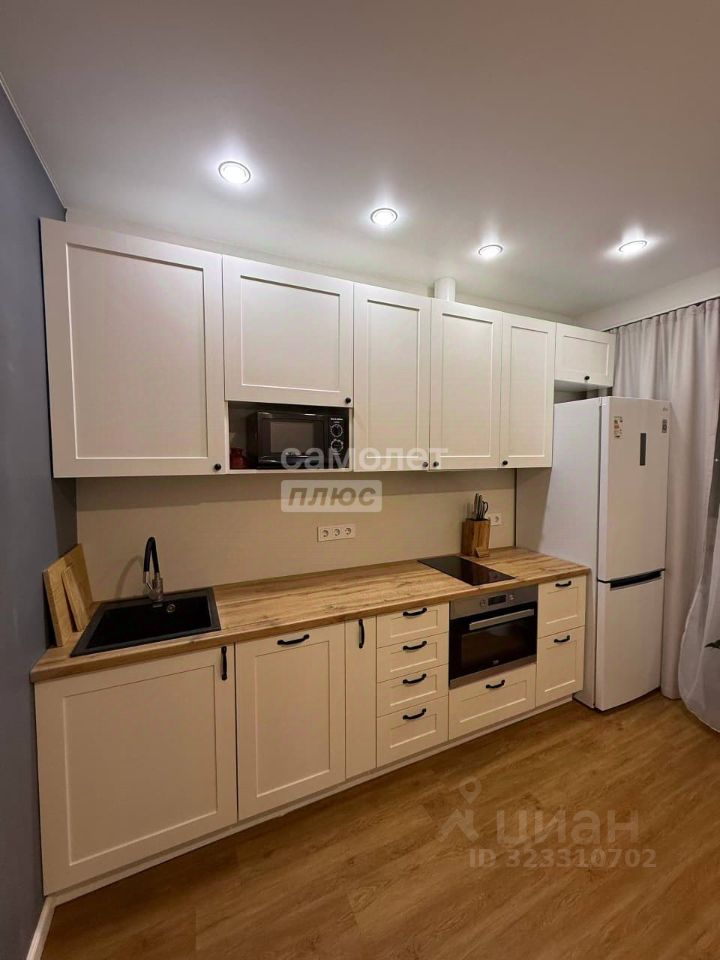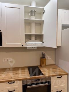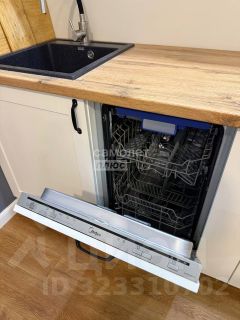 На кухне встроенная техника: индукционная плита духовой шкаф, вытяжка, посудомоечная машина.