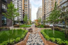 По фасаду ЖК действующая коммерция разного рода. Доступ на территорию закрыт от посторонних лиц и ведётся видеонаблюдение. Тематические площадки у каждого дома, плитка во дворе и много зелени. Так же на территории ЖК действует коммерция услуг по типу бьюти сферы и продуктовых магазинов.
