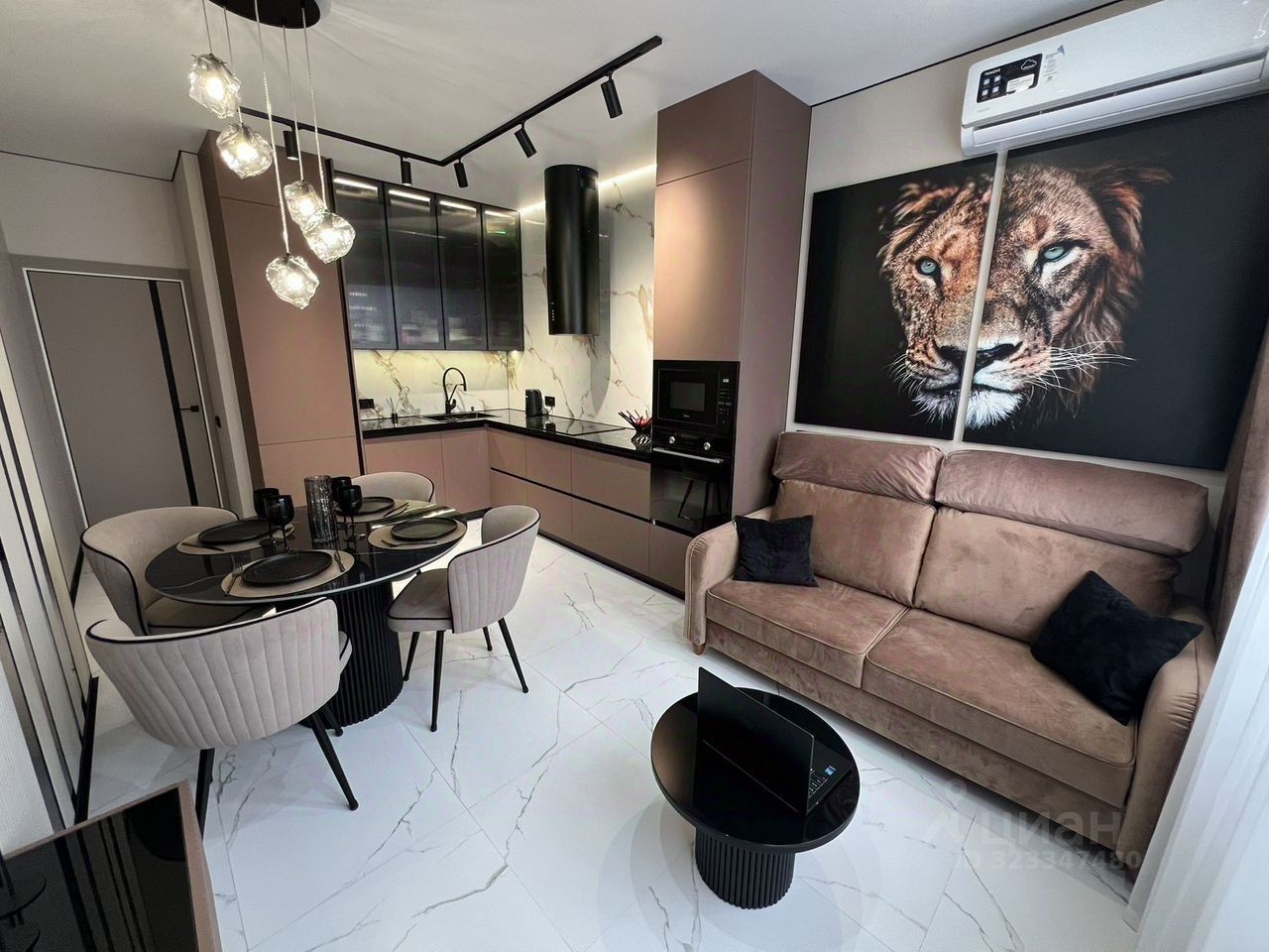 Качественный ремонт , полностью голосовое управление, шторы , теплый пол , чайник, подсветки , пылесос , телевизоры .