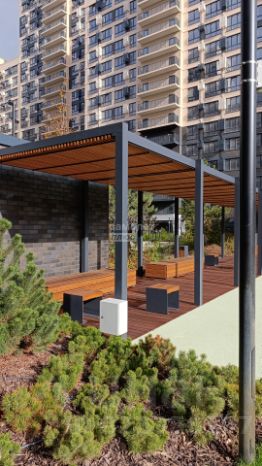 * Авторский двор-сад с фонтанами и лаунж-зонами, мини футбольное поле, спортивные сооружения для всех возрастов