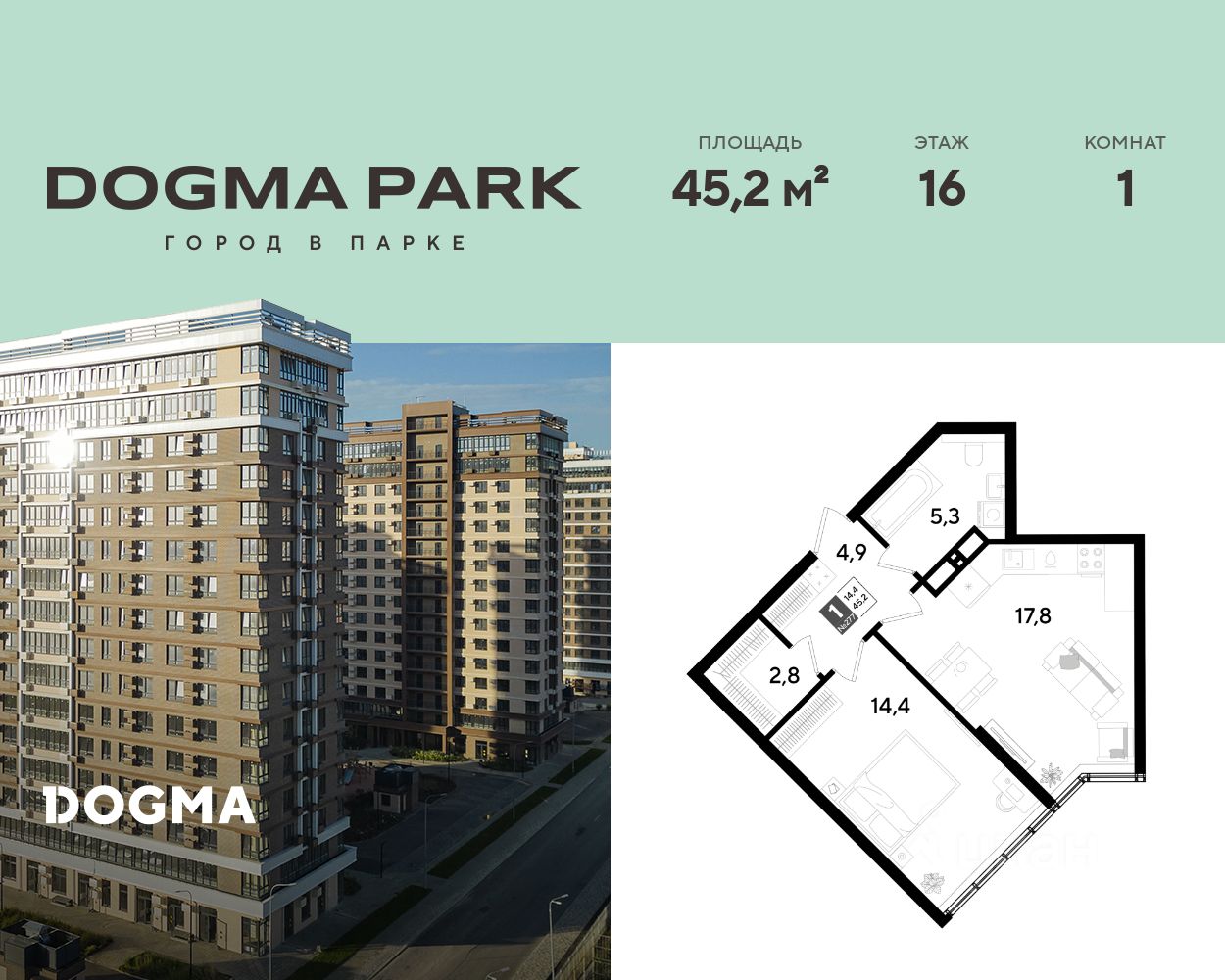 В продаже 1-комнатная квартира от застройщика! Мкр. "DOGMA PARK" г. Краснодар, Литер 30 Срок сдачи: 3 кв. 2027, общей площадью 45.2 кв.м., на 16 этаже.