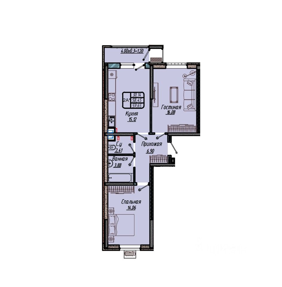 Общая площадь59,65 м²