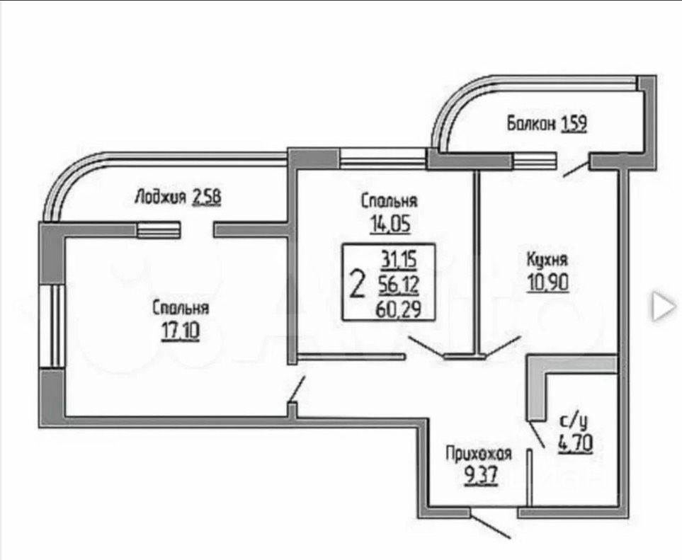 Квартира общей площадью 60,29 кв.м современной планировки: прихожая 9,37 кв.м, совмещенный санузел 4,7 кв.м, две изолированные комнаты, кухня-столовая 10,9 кв.м, балкон и лоджия.