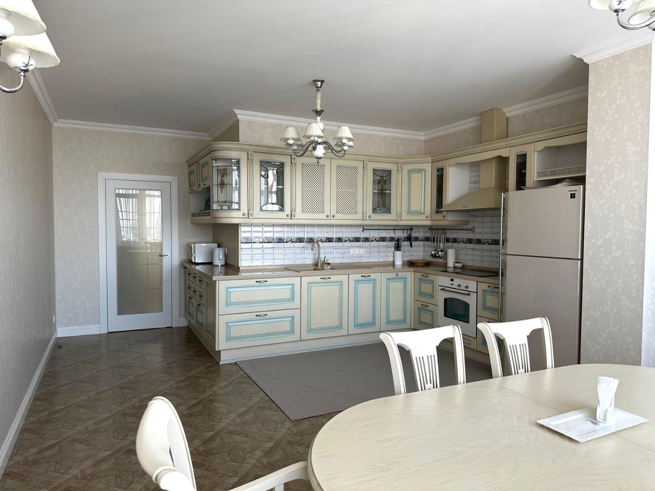 Кухня/столовая (29.7 кв.м) с видовыми окнами на двор, функциональным кухонным гарнитуром, современной техникой (NEFF, BOSCH, SHARP).