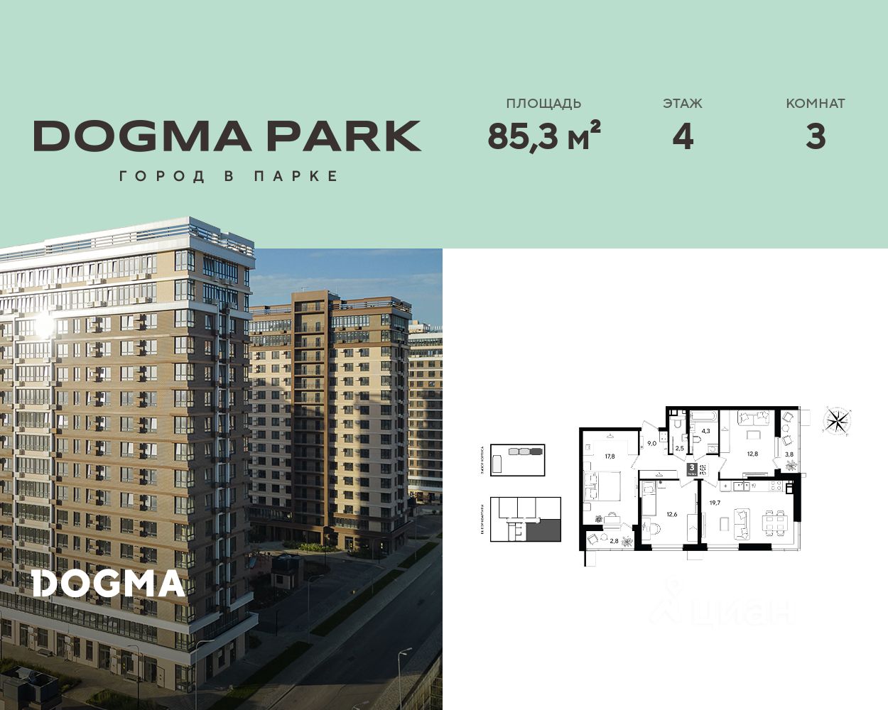 В продаже 3-комнатная квартира от застройщика! Мкр. "DOGMA PARK" г. Краснодар, Литер 8 Срок сдачи: 4 кв. 2026, общей площадью 85.3 кв.м., на 4 этаже.