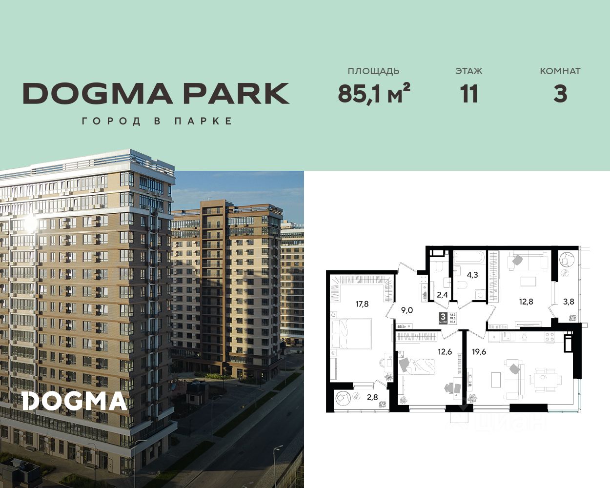 В продаже 3-комнатная квартира от застройщика! Мкр. "DOGMA PARK" г. Краснодар, Литер 8 Срок сдачи: 4 кв. 2026, общей площадью 85.1 кв.м., на 11 этаже.