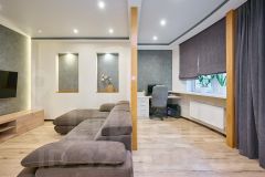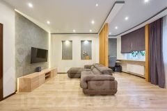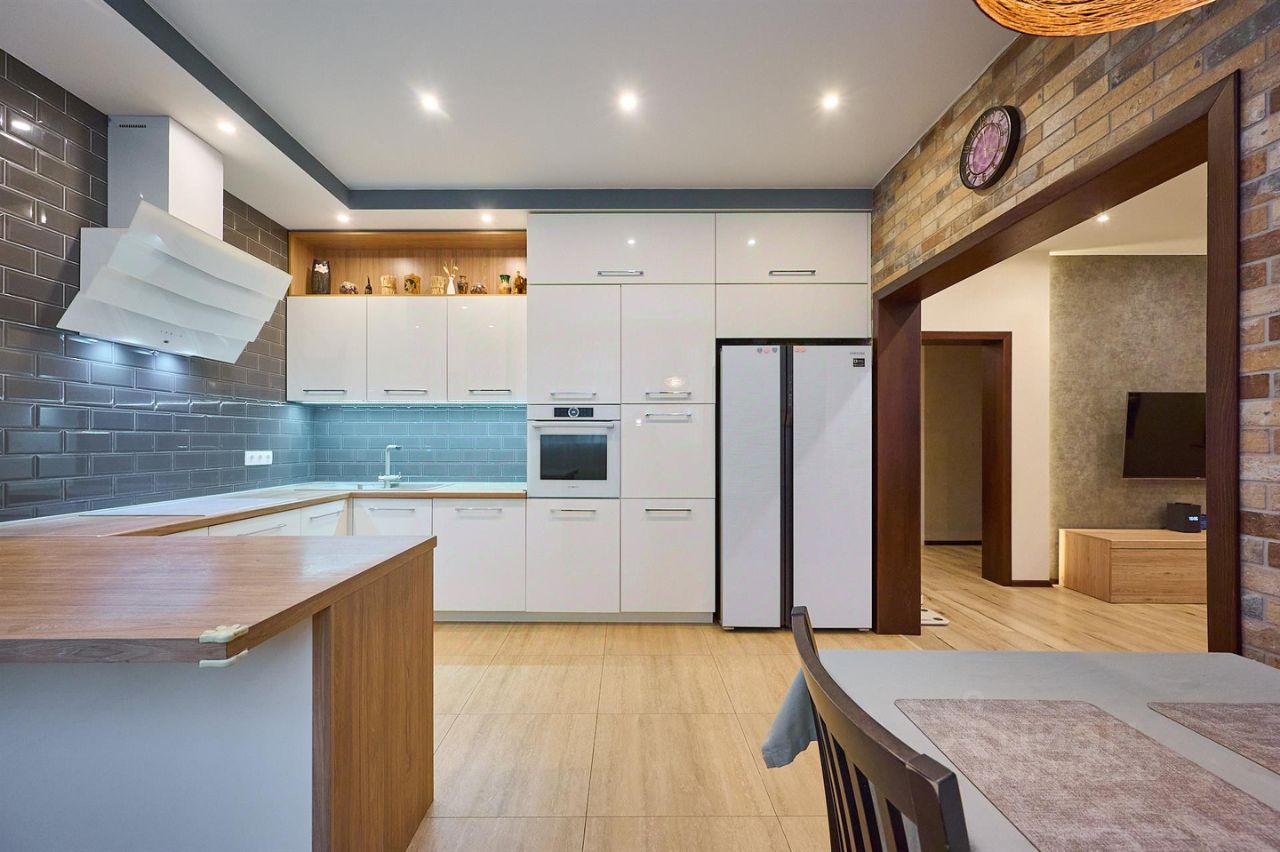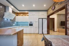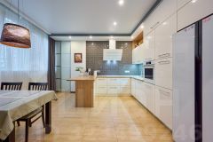 - Просторная кухня гостиная с обеденной зоной и отдельной рабочей зоной (техника BOSCH, итальянские фасады, комплектующие BLUM, двери массив)