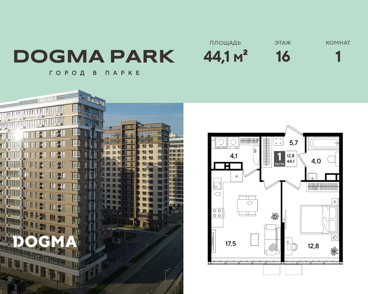 В продаже 1-комнатная квартира от застройщика! Мкр. "DOGMA PARK" г. Краснодар, Литер 34 Срок сдачи: 4 кв. 2027, общей площадью 44.1 кв.м., на 16 этаже.