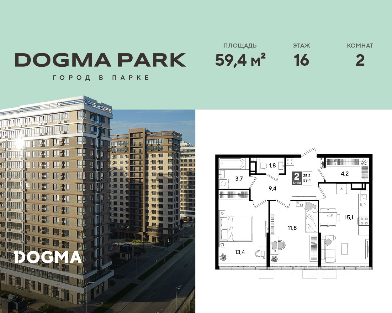 В продаже 2-комнатная квартира от застройщика! Мкр. "DOGMA PARK" г. Краснодар, Литер 34 Срок сдачи: 4 кв. 2027, общей площадью 59.4 кв.м., на 16 этаже.
