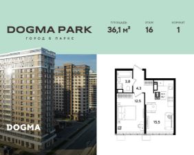 В продаже 1-комнатная квартира от застройщика! Мкр. "DOGMA PARK" г. Краснодар, Литер 34 Срок сдачи: 4 кв. 2027, общей площадью 36.1 кв.м., на 16 этаже.