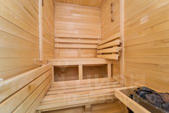 С электрической печью Sawo (Финляндия), с термометром и песочными часами. Есть приточная и вытяжная вентиляция. Время нагрева 1 час.