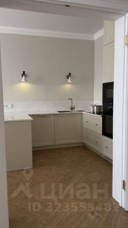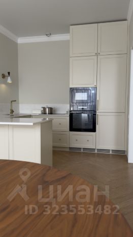Просторная кухня площадью — 15.28 кв. м. шкафы и столешница выполнены на заказ, фасады эмаль очень редкого цвета. Стол натуральный шпон над столом дизайнерская картина. Из техники встройка: кондиционер, холодильник, микроволновка, дух.шкаф, варочная панель, посудомойка, есть место под винный шкаф.