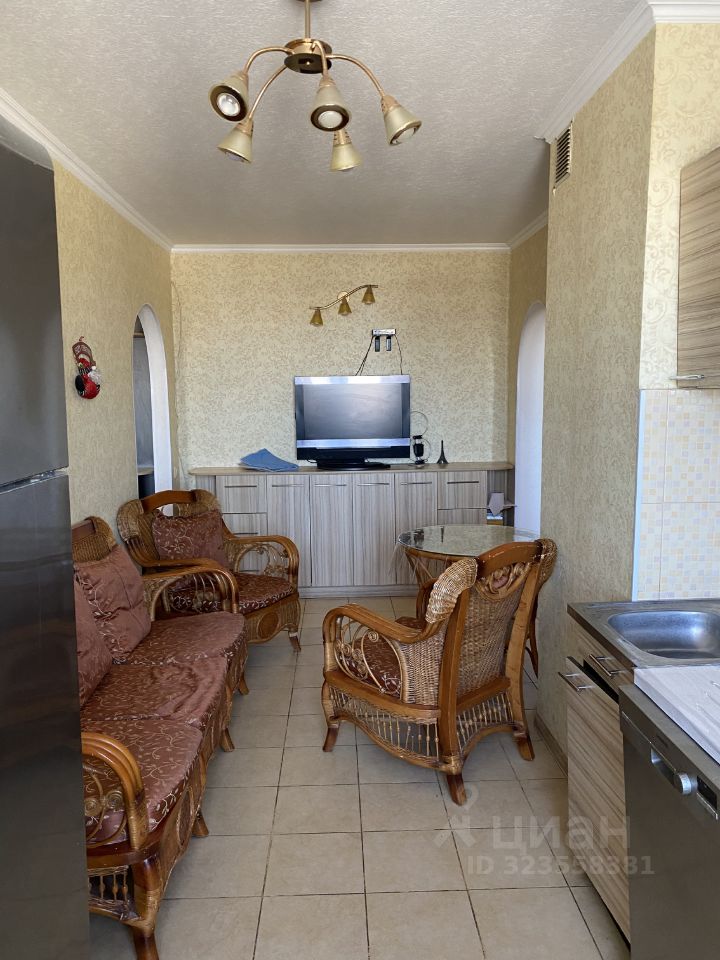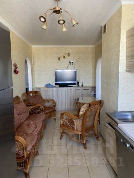 Кухня: гарнитур, холодильник, посудомоечная машина, газовая плита, мебель из ротанга - диван и два кресла, стол круглый со стеклянной столешницей, много шкафов для хранения посуды.