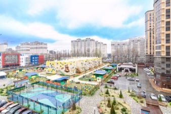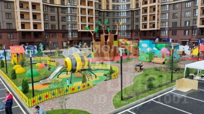 Красивые дворы комплекса с современными детскими и спортивными площадками, комфортное расстояние между домами, прогулочные аллеи, красивые локации, фонтан и т.д.