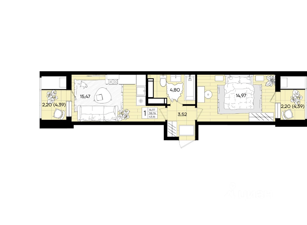 Общая площадь43,16 м²