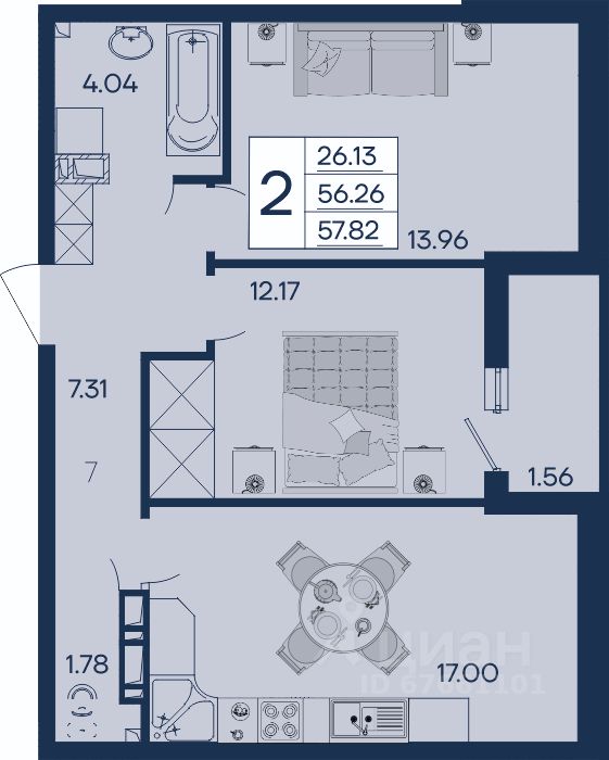 2 комнатная квартира с ремонтом 57.82 м², на 9 этаже в жилом комплексе "Дом 101".