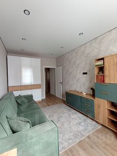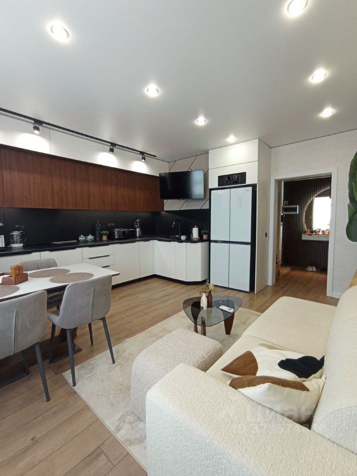 Евротрёшка с дизайнерским ремонтом и видом на зелёный двор. Ремонт был выполнен для себя. Без компромиссов по качеству, стилю и удобству. Квартира создавалась с нуля по индивидуальному проекту: с продуманной планировкой, премиальными материалами и мебелью на заказ. Сердце квартиры Просторная кухня-гостиная, оформленная в современном стиле. Стены выполнены в технике lime wash. Такое покрытие не только эстетично, но и экологично отлично дышит и регулирует влажность.