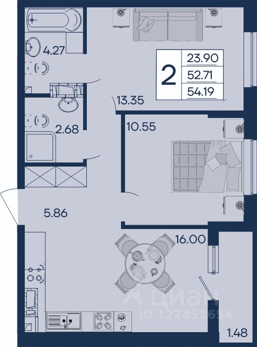 2 комнатная квартира с ремонтом 54.19 м², на 3 этаже в жилом комплексе "Дом 101".
