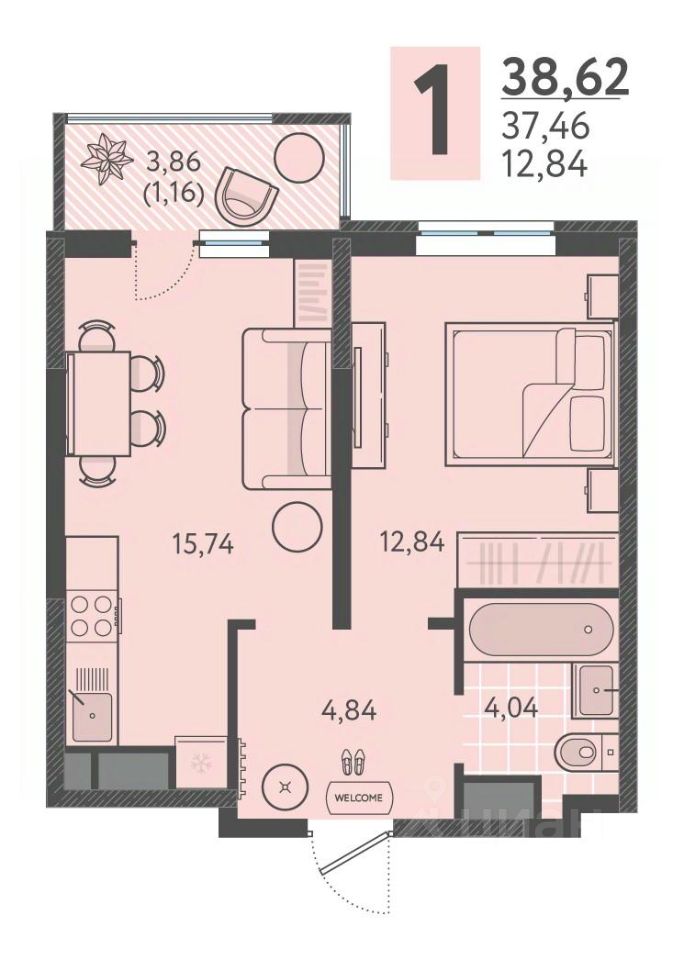 Общая площадь38,62 м²