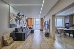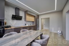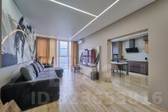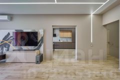 В квартире выполнен ремонт из премиальных материалов в современном стиле, плитка Испания PORCELANOSA , ручная роспись на пано в гостиной и на кухне, краска на стенах английского производителя Little Greene, дизайнерские радиаторы Loten, регулируемая RGB подсветка, мебель изготавливалась эксклюзивно на заказ, брендовая техника .