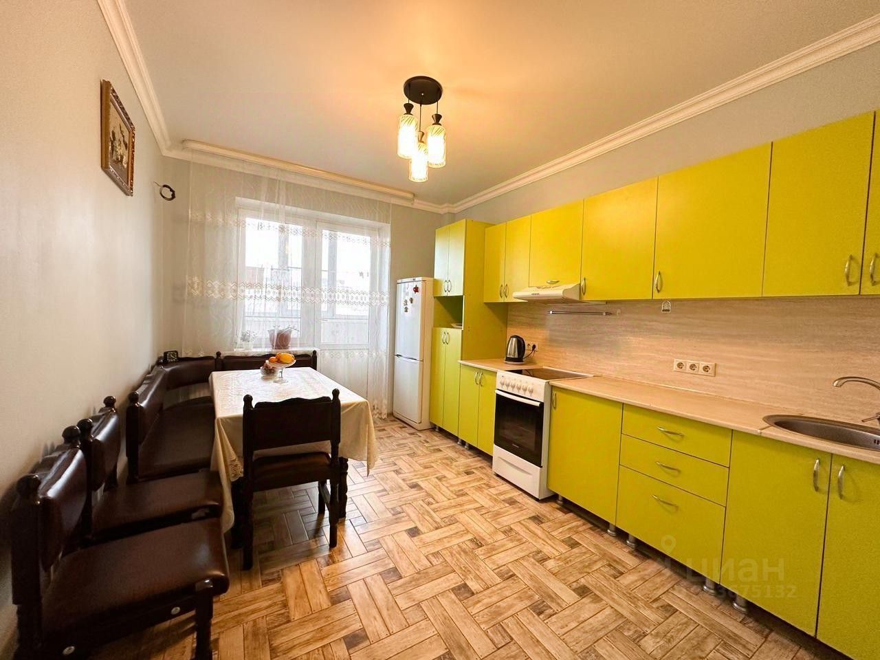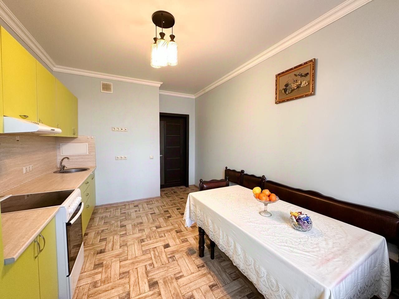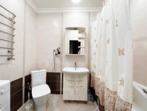 Ремонт сделан из качественных материалов. Натяжные потолки, ламинат в комнатах, а на кухне и в коридоре плитка. На стенах обои в светлых нейтральных тонах. Санузел тоже полностью в плитке. Огромная ленточная лоджия. Квартира без обременений, документы готовы к продажи.