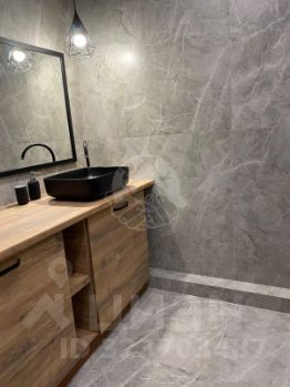 ванной комнате выложен керамогранит, остается тумба с раковиной , душевая кабина, зеркало.