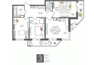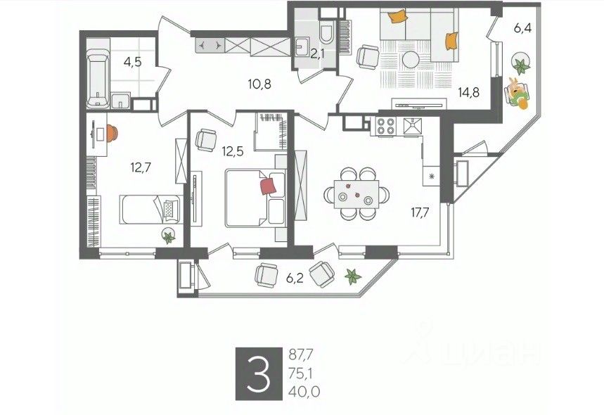 В продаже 3-комнатная квартира от застройщика! ЖК "Рекорд", г. Краснодар, Литер 5, общей площадью 87.7 кв.м., на 21 этаже.