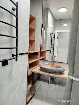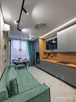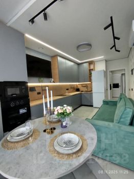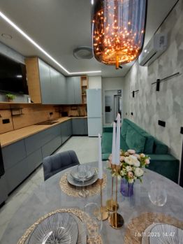 со встроенной техникой (посудомоечная машина, микроволновая печь, индукционная плита, духовой шкаф с конвекцией, вытяжка), вместительный холодильник Lex объёмом 456 л!, многофункциональная мойка, инверторная стиральная машина, есть место под сушильную машину, TV 55 диагональ, кондиционер 12ка, раскладной диван, стол, мягкие удобные стулья.