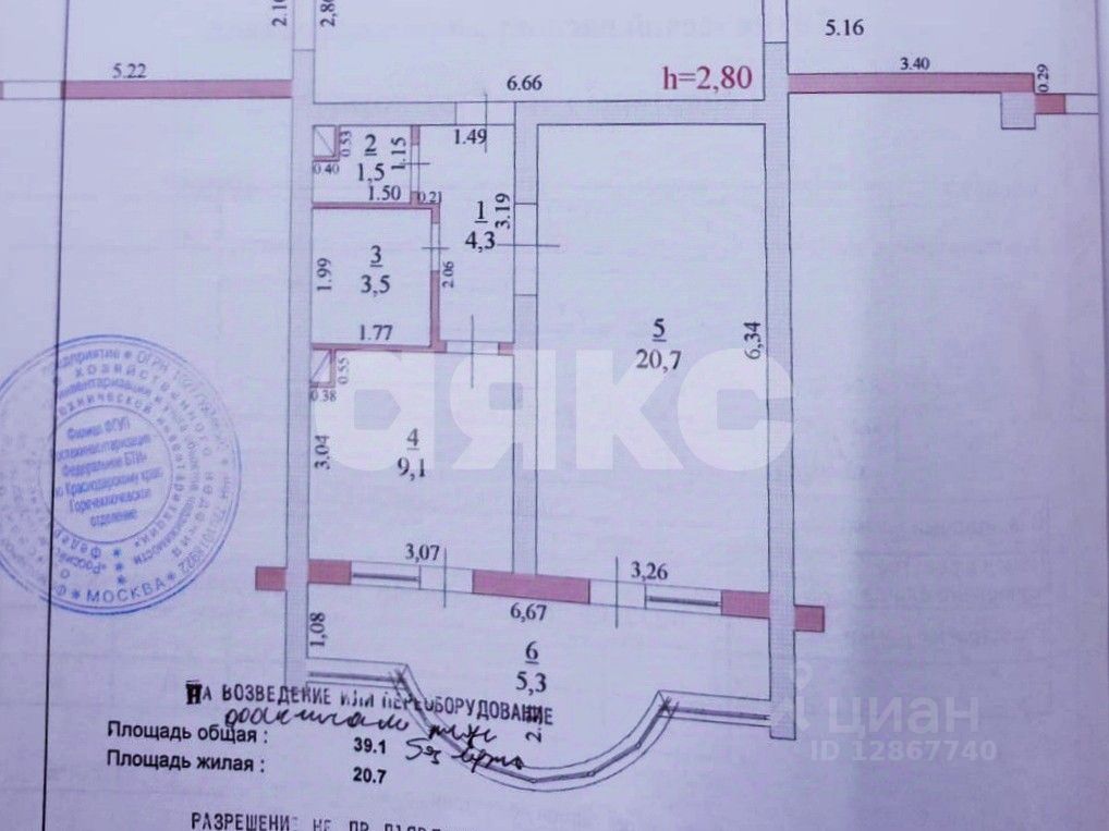 Общая площадь - 39.1 кв.м.