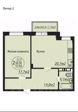 Общая площадь - 55,9 кв.м, кухня-гостиная - 20,7 кв.м