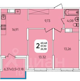 Общая площадь - 57,3 кв.м, кухня - 14 кв.м