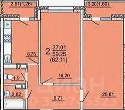 59,4 кв.м, 6 этаж из 16 в монолитно-кирпичном доме