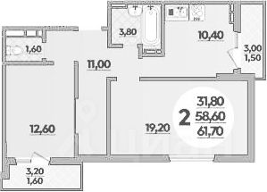 • Общая площадь (с учётом лоджии по понижающему коэффициенту) — 61,7 м²