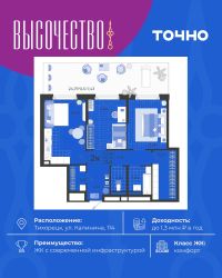 "Высочество" — первый ЖК комфорт-класса в Тихорецке. Современные технологии, новейшие представления о комфорте и эргономике жилья -это, то, что характеризует этот комплекс. Расположен в самом центре города. "Высочество" — это полностью самостоятельный жилой комплекс, жителей которого порадуют закрытый и свободный от машин двор, коммерческая галерея, спортивные и детские площадки с перголами для отдыха, уютная мангальная зона. По периметру жилого комплекса - открытый бесплатный паркинг на 370 м/мест. Недалеко от ЖК "Высочество" находятся детский сад, школы-гимназии, поликлиника, торговый центр, в пешей доступности расположен любимый сквер жителей города "Звездный".