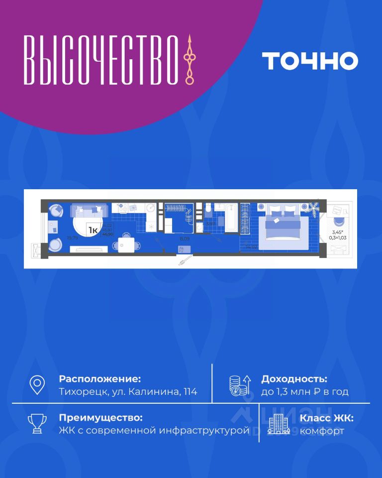 "Высочество" — первый ЖК комфорт-класса в Тихорецке. Современные технологии, новейшие представления о комфорте и эргономике жилья -это, то, что характеризует этот комплекс. Расположен в самом центре города. "Высочество" — это полностью самостоятельный жилой комплекс, жителей которого порадуют закрытый и свободный от машин двор, коммерческая галерея, спортивные и детские площадки с перголами для отдыха, уютная мангальная зона. По периметру жилого комплекса - открытый бесплатный паркинг на 370 м/мест. Недалеко от ЖК "Высочество" находятся детский сад, школы-гимназии, поликлиника, торговый центр, в пешей доступности расположен любимый сквер жителей города "Звездный".