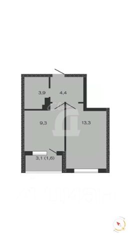 Площадь кухни - 9,3 кв.м., комнаты 13.3 кв.м.