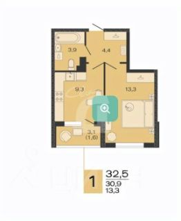 Общая площадь квартиры - 32,5 кв.м.