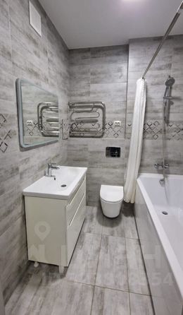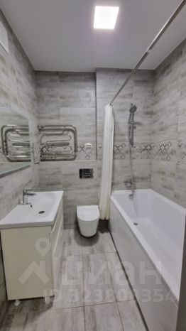- Современный санузел с удобной инсталляцией, ванной и вместительной тумбой.