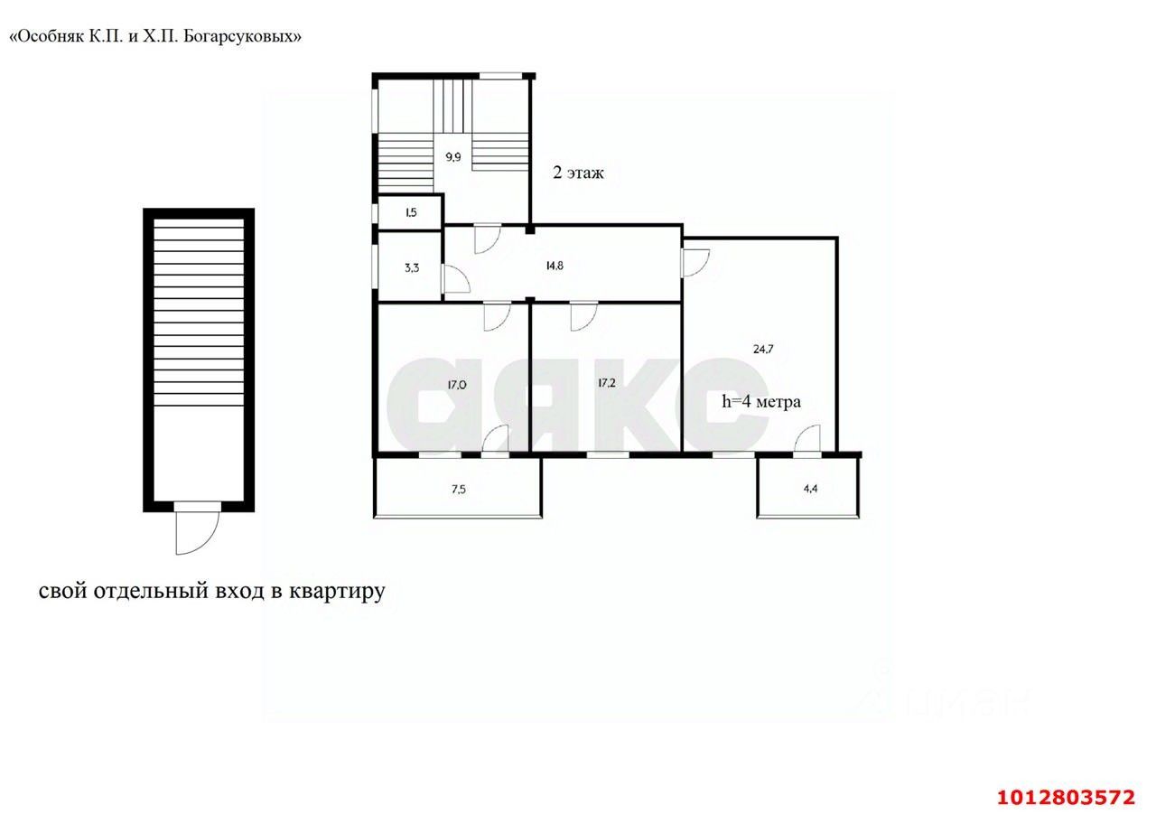 Особняк К.П. и Х.П. Богарсуковых построенный в 1910 году. Братья Богарсуковы -это крупные Кубанские предприниматели в области торговли, домовладельцы и благотворители. По происхождению (черкесские армяне), занимались мануфактурной торговлей в середине XIX -ХХ века. В продаже, статус "квартира", 100 м2, на втором этаже. Изюминка этой квартиры - это индивидуальный собственный вход с улицы, своя парадная лестница. Высота потолка 4 метра, центральные коммуникации. Закрытый двор, своя зона парковки для собственников.