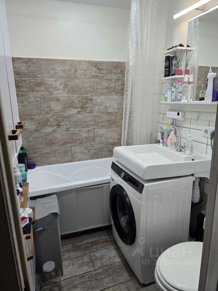 Санузел совмещённый. Установлена специальная раковина для стиральной машины. Есть дополнительный свет над зеркалом, много полочек. Ванная глубокая с широкими бортиками и противоскользящим рисунком.