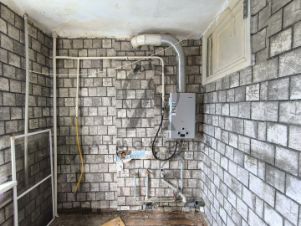 Небольшая кухня, установлен новый газовый водонагреватель.