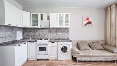 Кухня, укомплектованная встроенной техникой: холодильник, плита, духовой шкаф, стиральная машина.