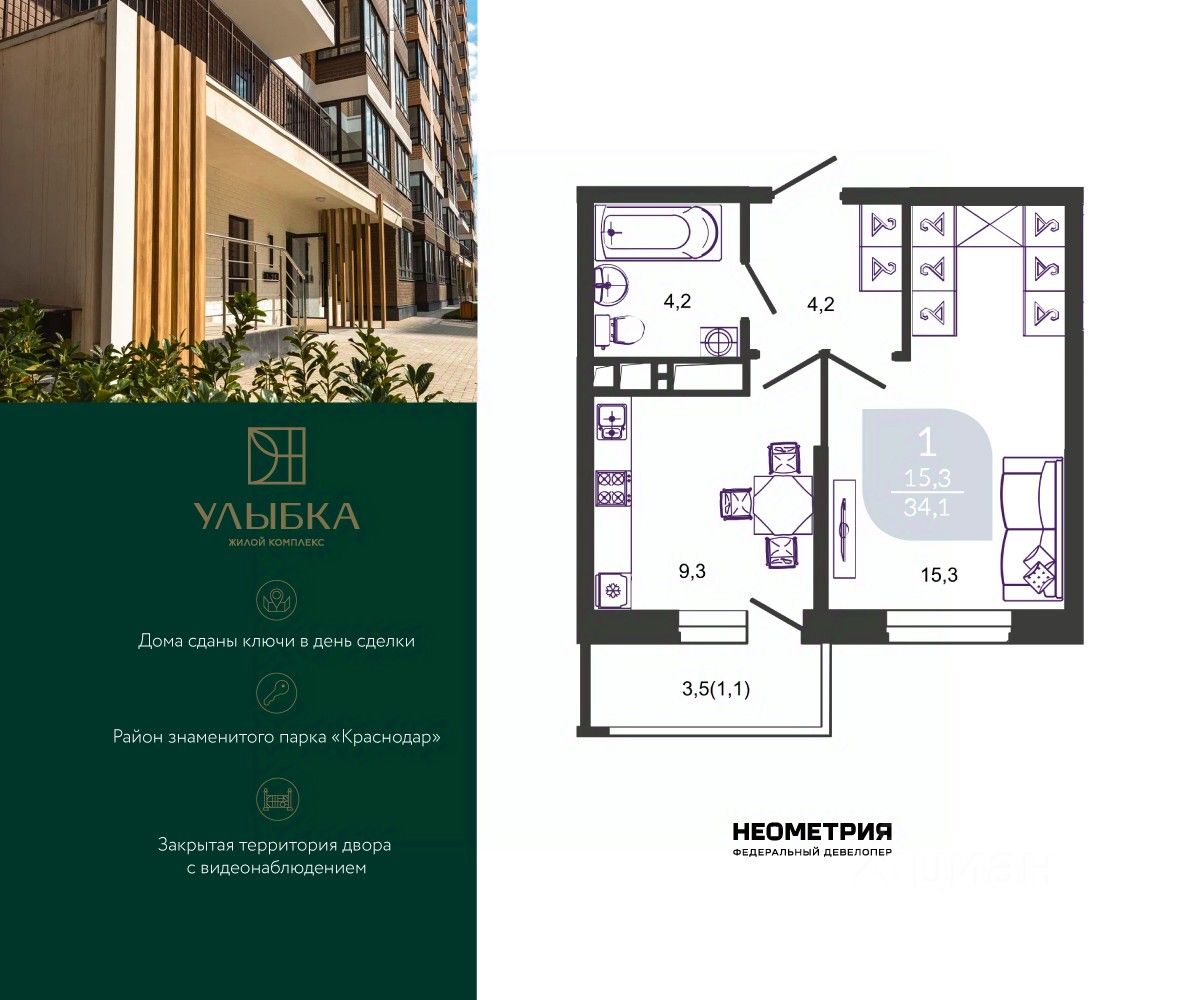 Продается квартира в жилом комплексе "Улыбка" от федерального девелопера "Неометрия". Все дома сданы, ключи в день сделки.