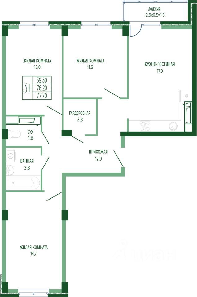 Жилая площадь39,3 м²