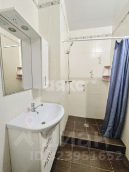 В совмещенном санузле: душевой поддон из керамогранита, сантехника, установлен водонагреватель, раковина с тумбой и шкафом с зеркалом.