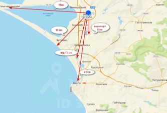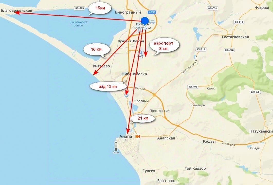 До песчаного пляжа 10 км (п. Витязево), а до лимана (ст. Благовещенская ) - 15 км.